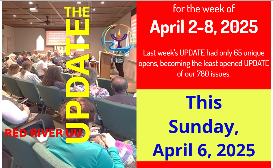 Each Wednesday we send out “the UPDATE” an email to everyone interested (currently 222 people). The UPDATEl gives a quick overview of everything going on at church from Wednesday to the following Wednesday inclusive. It is not a replacement for Red River Ramblings, but a quick update because in busy lives we sometime forget stuff. It always lists the upcoming Sunday schedule including the Morning Assembly along with the Adult Forum schedule of topics.