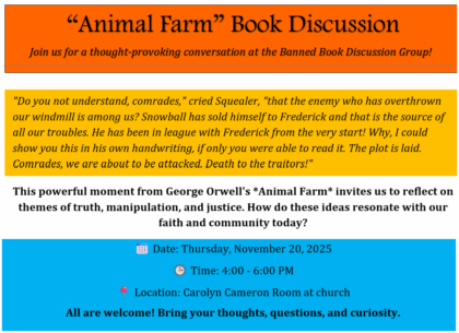 A new group, The Banned Book Club holds its first meeting on Thurs. Nov 20 from 4-6 pm at church. The book to be discussed at this first meeting is the 1945 novella Animal Farm by George Orwell, whose real name was Eric Arthur Blair.